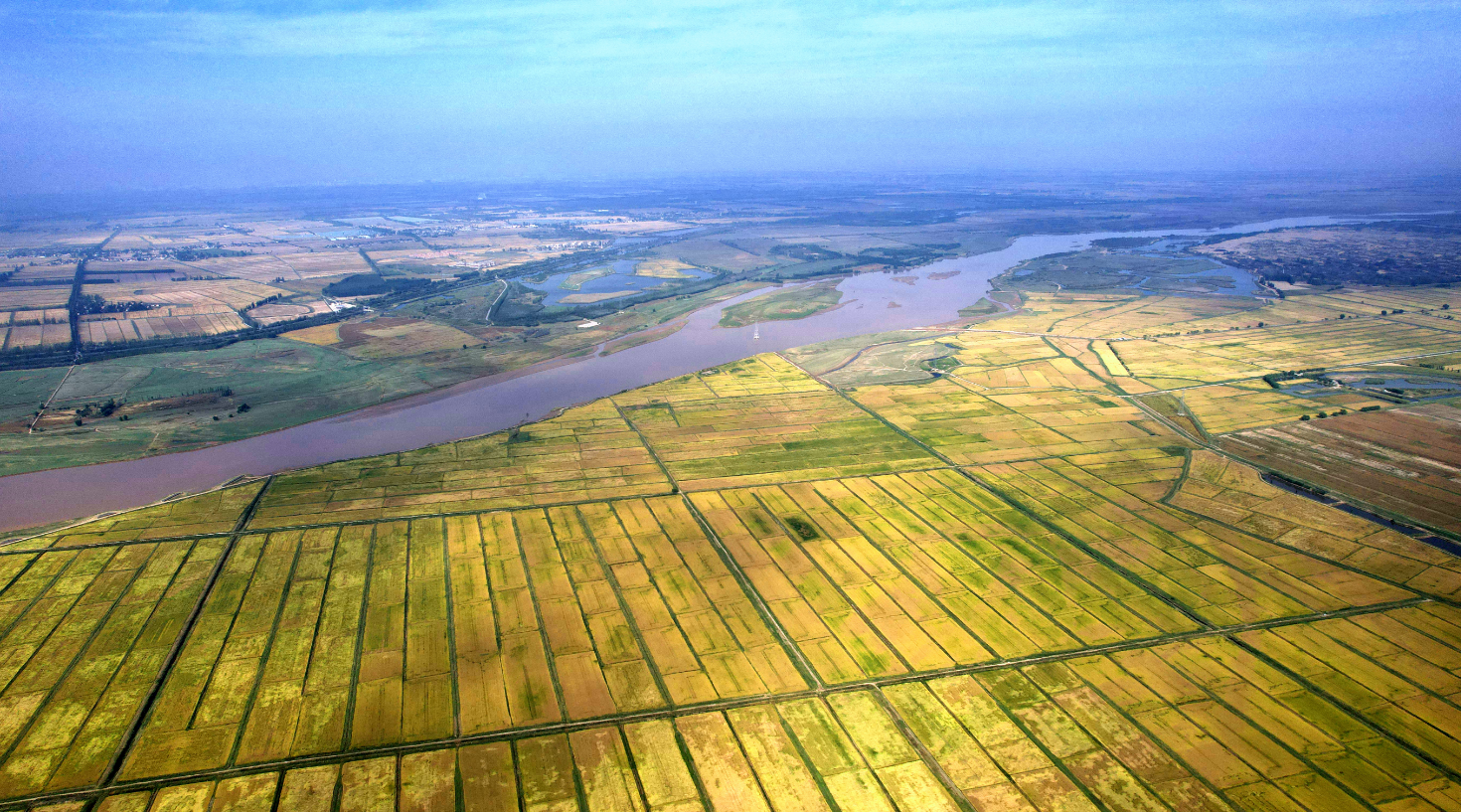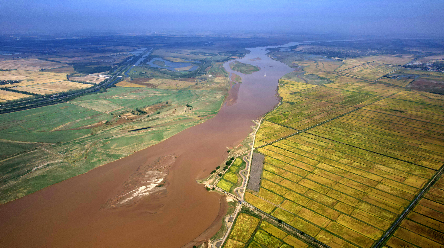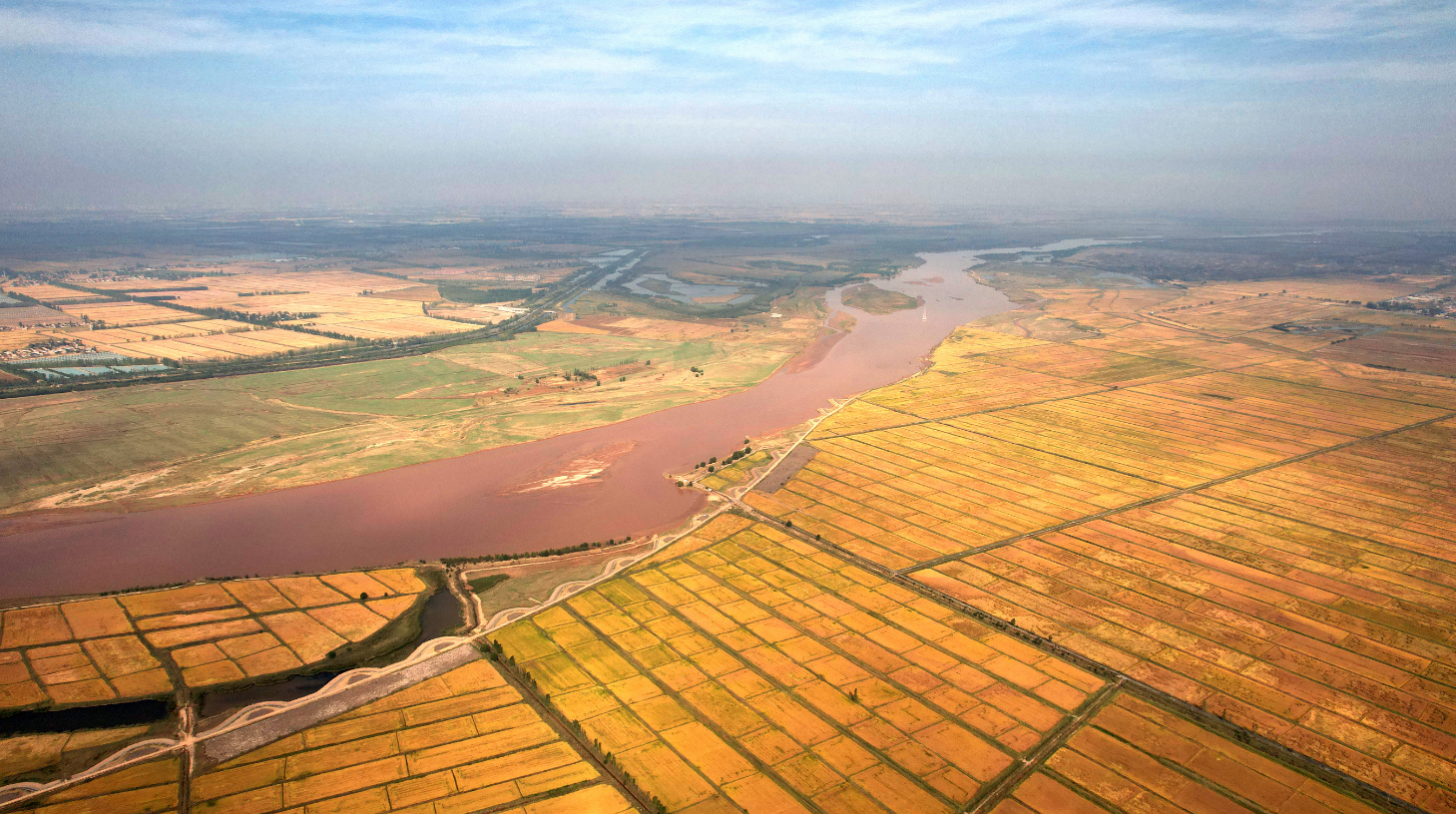 9月26日,无人机镜头下,黄河两岸稻浪翻金,丰收在望。